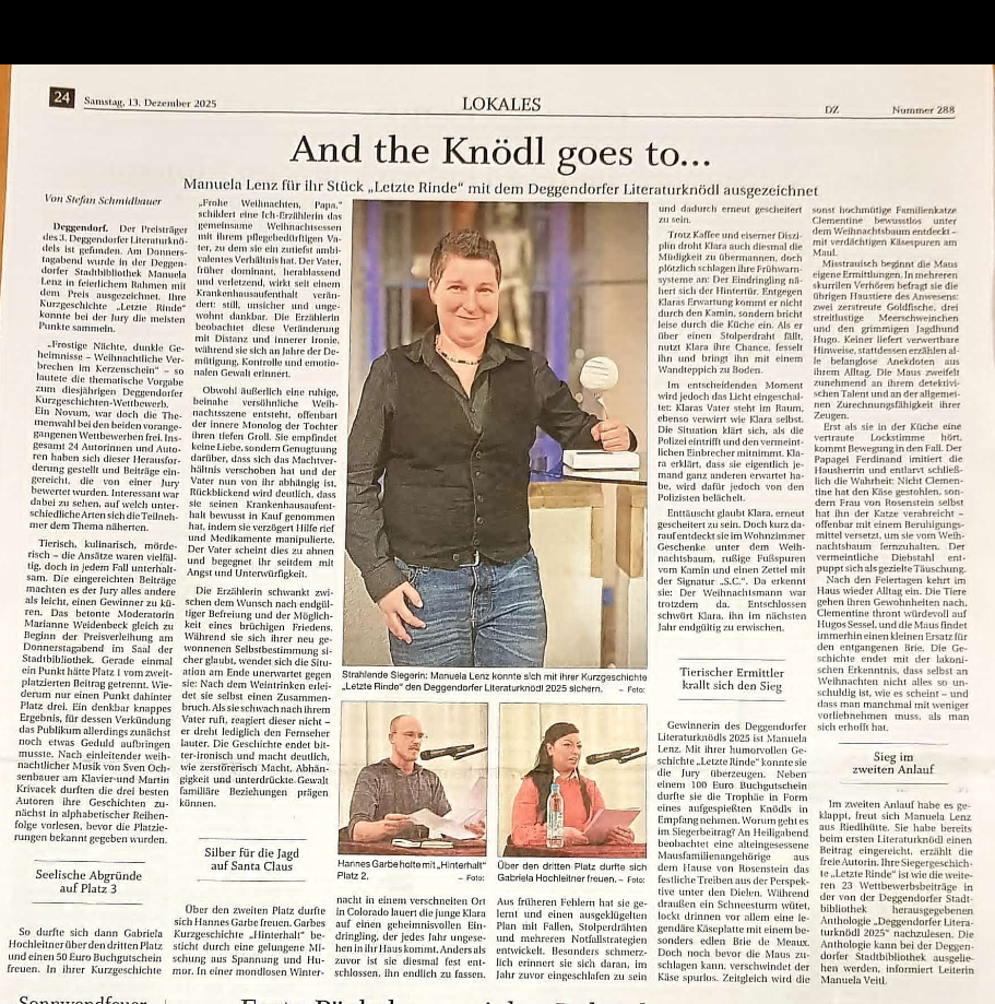 Hier war ich die Drittplatzierte beim Deggendorfer Literaturknödl. Eine butne Mischung aus humorvollen aber auch gruseligen Weihnachtsgeschichten entstand an diesem Abend :)